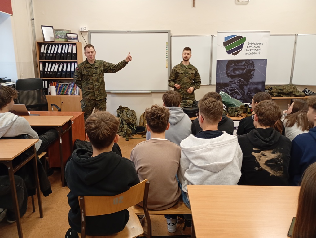 11 grudnia br. w II LO odbyło się interesujące i pełne wrażeń spotkanie z przedstawicielami Wojskowego Centrum Rekrutacji, w którym uczestniczyli uczniowie klas 1a, 4b oraz 4f. Była to wyjątkowa okazja, aby z bliska poznać specyfikę służby wojskowej oraz możliwości, jakie oferują współczesne Siły Zbrojne RP.