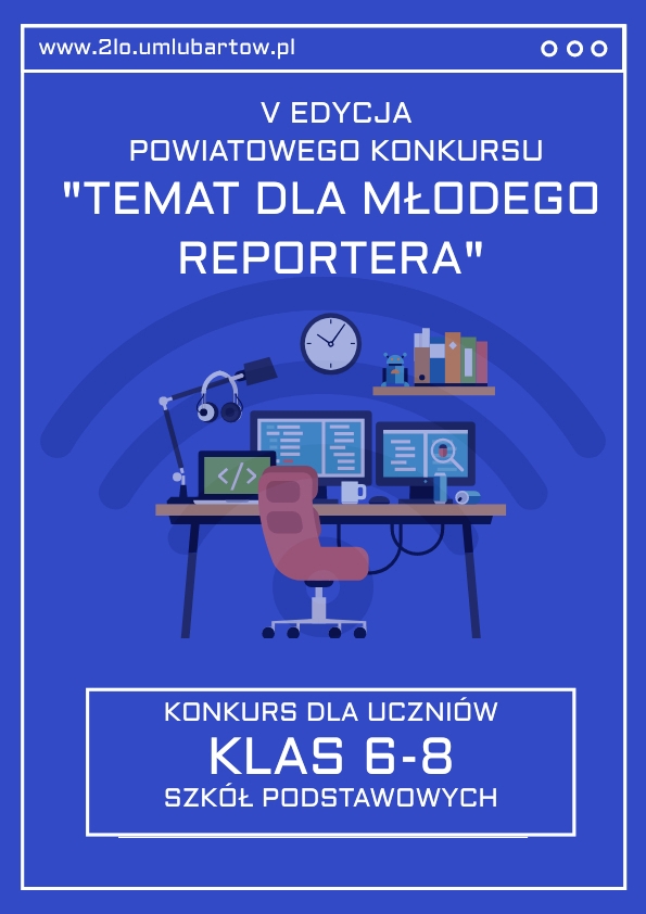 II LO w Lubartowie ma zaszczyt zaprosić do udziału w V edycji Powiatowego Konkursu „Temat dla młodego reportera”. Zadaniem dla młodego reportera jest znalezienie tematu, który go interesuje, i przedstawienie go w formie literackiej lub plastycznej.
