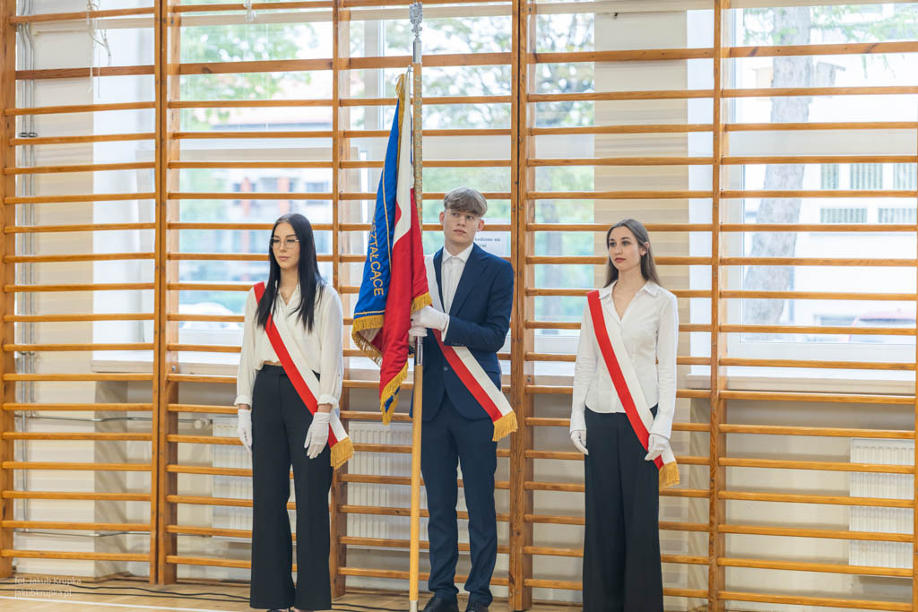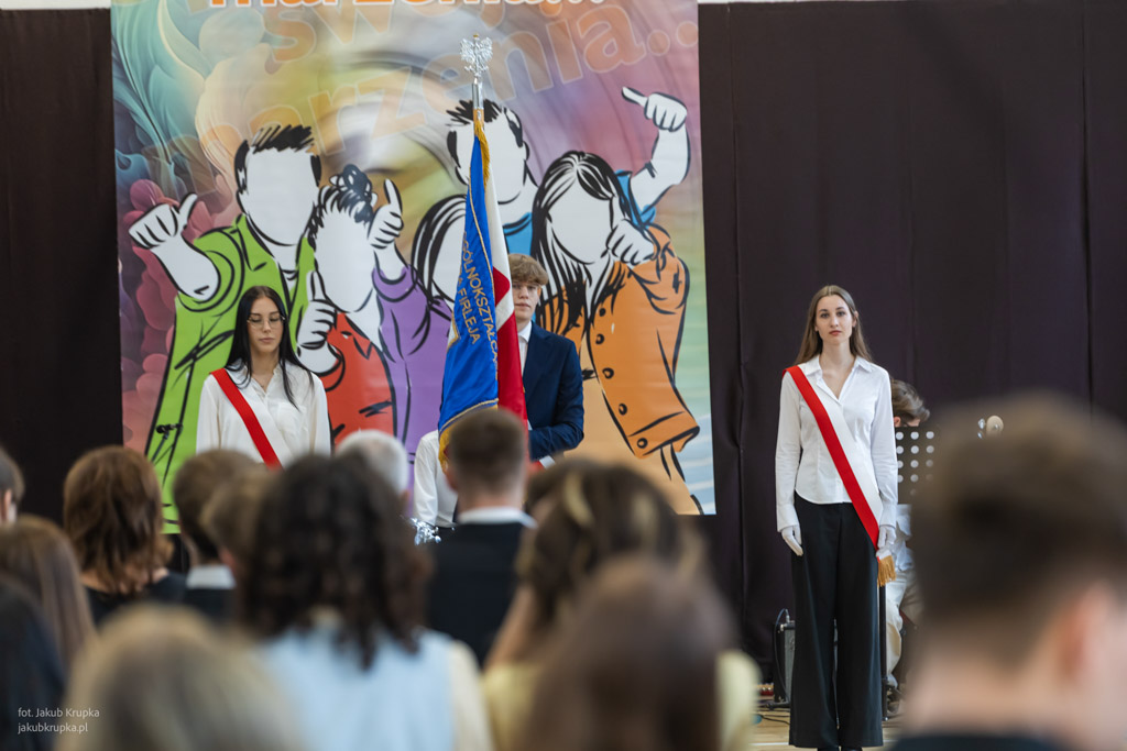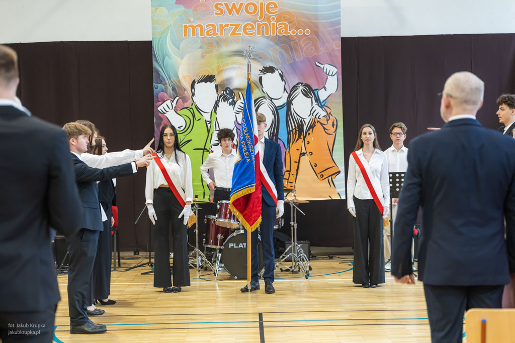 Po wystąpieniach gości tegoroczni maturzyści uroczyście ślubowali: Zdobytą wiedzą i umiejętnościami budować dobro własne i innych. Dbać o honor i tradycje szkoły. Pogłębiać świadomość narodową. Szanować godność ludzką, prawa człowieka do życia w miłości i wolności. Następnie przedstawiciele klas IV przekazali swoim młodszym kolegom sztandar szkoły.