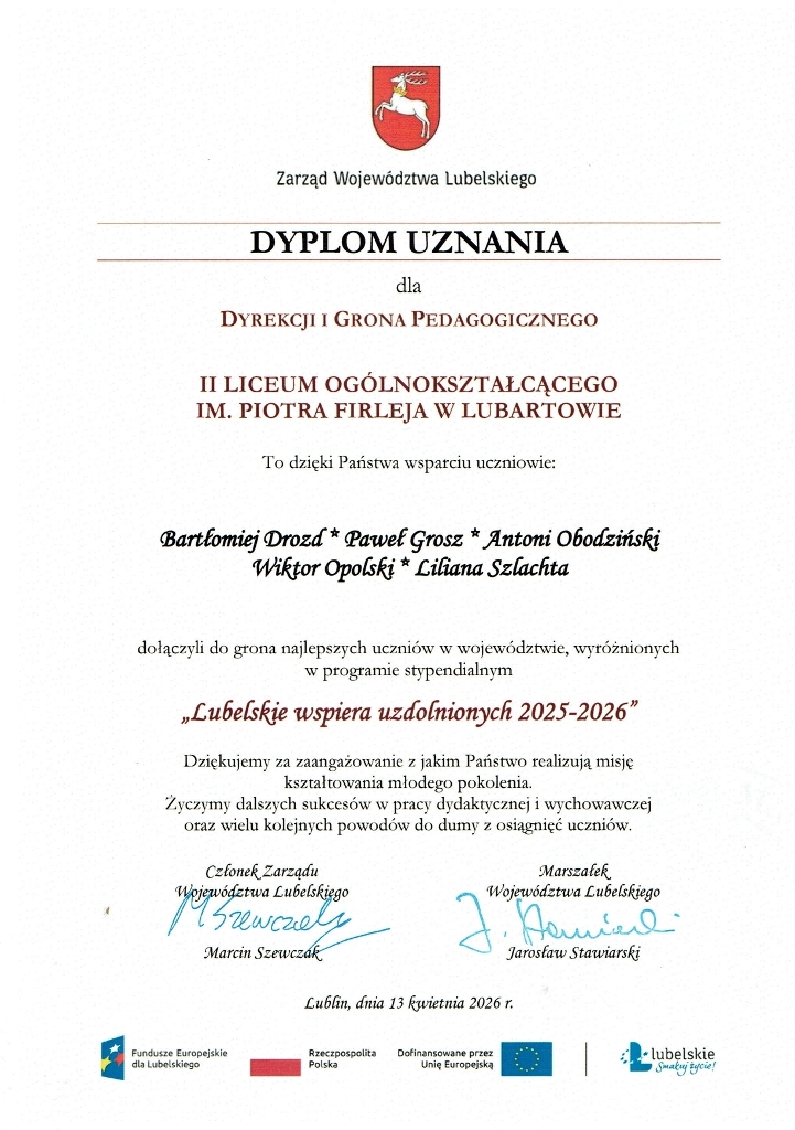 II Liceum Ogólnokształcącego im. Piotra Firleja w Lubartowie ma kolejne powody do dumy, tym razem za sprawą sukcesów uzdolnionych uczniów z klas o rozszerzeniu matematyczno-fizycznym.