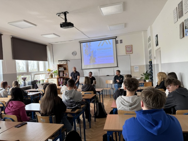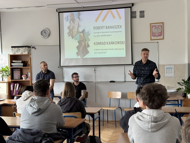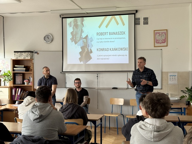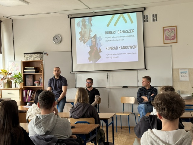 W dniu 16 kwietnia 2026 roku uczniowie klas I A i III D uczestniczyli w spotkaniu "Akademia Dialogu - Młodzi przeciw hejtowi", którego głównym celem była organizacja młodzieżowej konferencji poświęconej zjawisku hejtu, uświadomieniu uczniom odpowiedzialnej komunikacji w internecie oraz budowaniu świadomych relacji rówieśniczych.