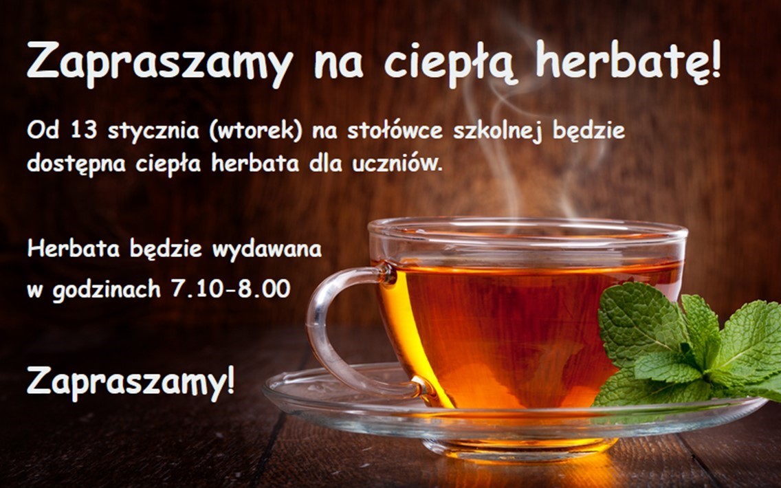 Od 13 stycznia (wtorek) na stołówce szkolnej będzie dostępna ciepła herbata dla uczniów. Herbata wydawana będzie w godzinach 7.10-8.00. Zapraszamy!