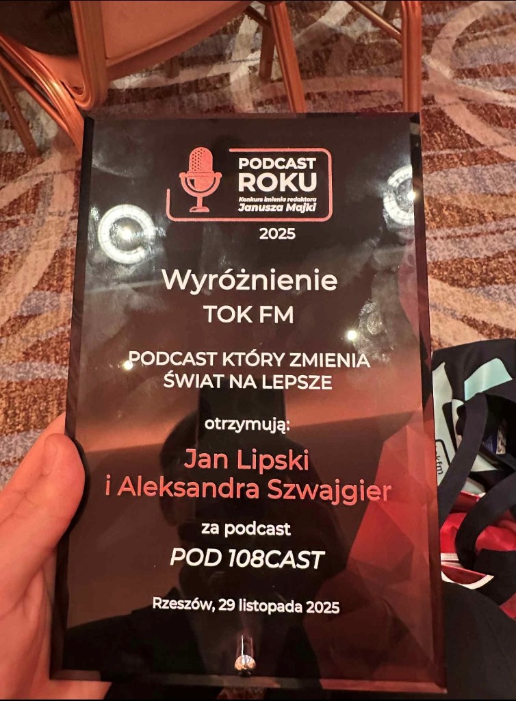 W Andrzejkowy wieczór 29 listopada w Rzeszowie Ola Szwajgier z kl. IV d, Janek Lipski z kl. III a, Paulina Mazurek z kl. III a i Karol Żelazek z kl. III d uczestniczyli w gali rozdania nagród w ramach konkursu "PODCAST ROKU" imienia redaktora Janusza Majki.