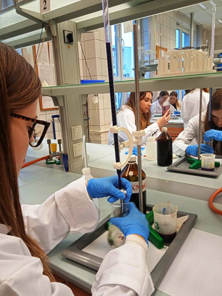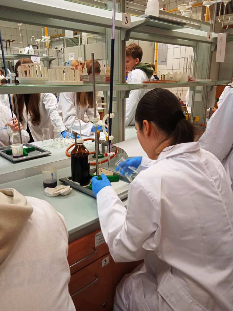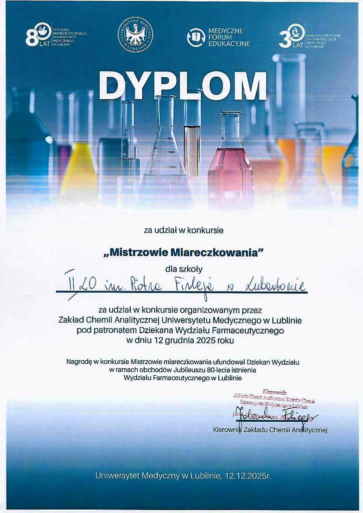 W piątek 12.12.2025r. uczniowie klasy IIIB w składzie: Amelia Majcher, Oliwia Iżko, Alicja Łuszczyńska, Marcelina Sarna i Paweł Grosz uczestniczyli w konkursie chemicznym pt. ,,Mistrzowie miareczkowania” organizowanym przez Zakład Chemii Analitycznej Uniwersytetu Medycznego w Lublinie.