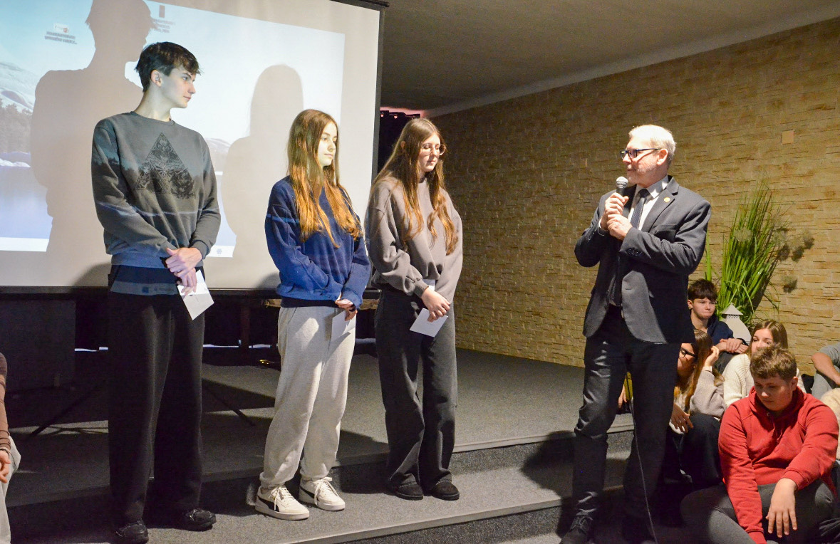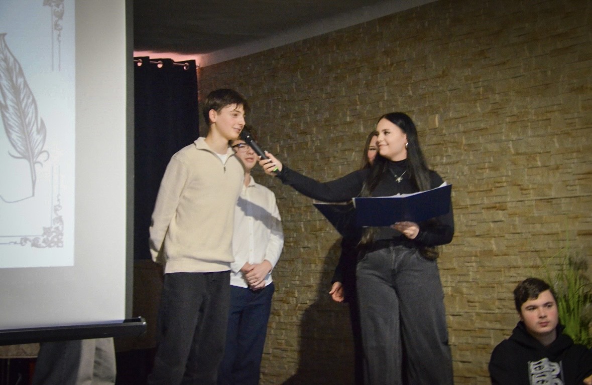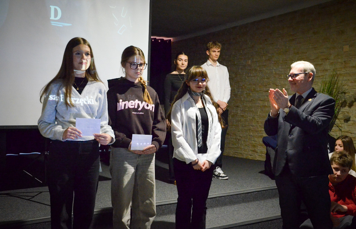 W Andrzejkowy wieczór 29 listopada w Rzeszowie Ola Szwajgier z kl. IV d, Janek Lipski z kl. III a, Paulina Mazurek z kl. III a i Karol Żelazek z kl. III d uczestniczyli w gali rozdania nagród w ramach konkursu "PODCAST ROKU" imienia redaktora Janusza Majki.