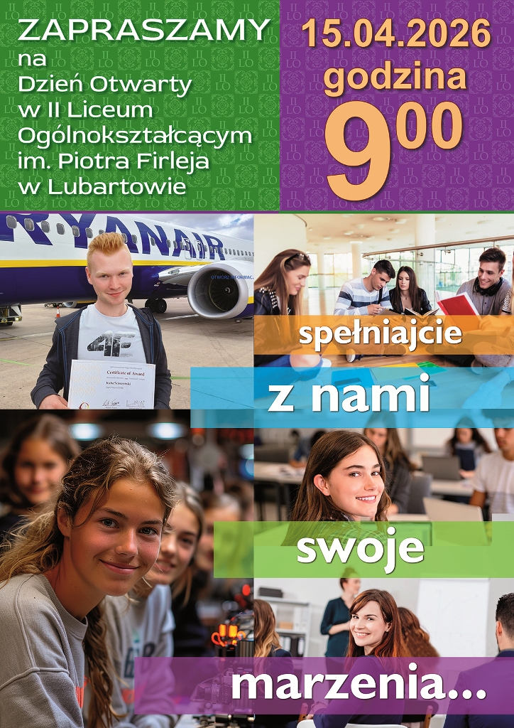 Zapraszamy na Dzień Otwarty w II Liceum Ogólnokształcącym im. Piotra Firleja w Lubartowie, który odbędzie się 15 kwietnia o godz. 9.00. Będzie to doskonała okazja, aby odwiedzić naszą szkołę, poznać ofertę edukacyjną, nauczycieli oraz uczniów. Serdecznie zachęcamy do udziału w tym wydarzeniu!