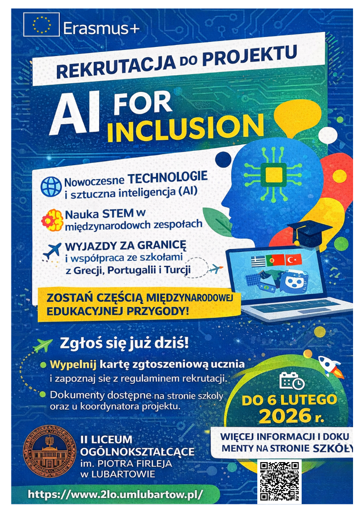 II Liceum Ogólnokształcące im. P. Firleja w Lubartowie rozpoczyna rekrutację uczniów klas I–III LO do udziału w międzynarodowym projekcie Erasmus+ „AI for Inclusion”
