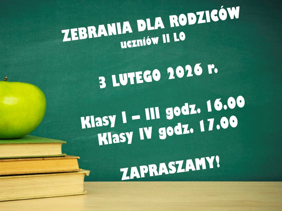 Informujemy, że dnia 3 lutego 2026 r. odbędą się zebrania dla rodziców uczniów II LO.